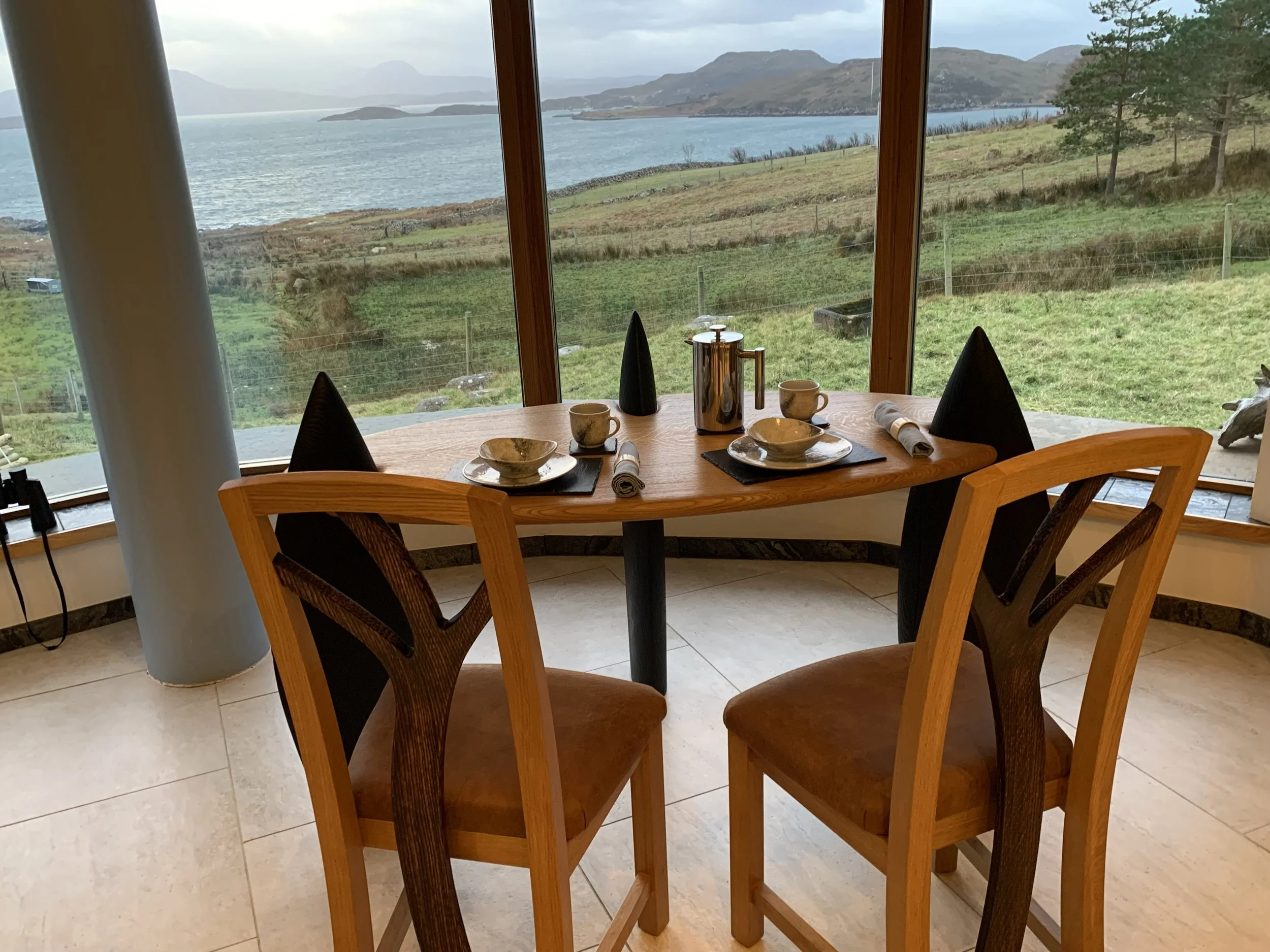 Our nouveau-broch was utterly gorgeous, inside and out. The owners, Reiner and Sheilagh Luyken, definitely improved on the Iron Age original. The exterior walls are fitted stone, and the floor plan is still circular. But there’s a wide bay window that gives a full 180-degree-view of Loch Broom—one of the largest sea lochs in Scotland. Instead of farm animals in the basement, electric underfloor heating kept us warm on cold nights. And they’ve added a fully modern bathroom, sauna, and kitchen.